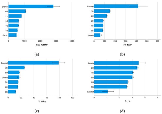Comparative representation of the depth-sensing indentation parameters ((a) Martens Hardness, HM; (b) Vickers hardness, HV; (c) indentation modulus, Y; (d) creep, Cr) of the tooth structure (enamel and dentin) and CAD/CAM RBCs.