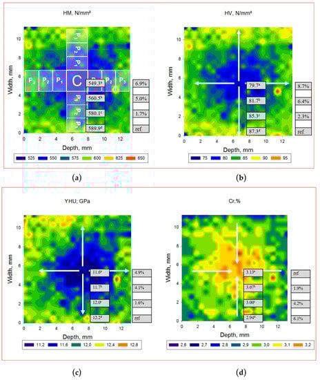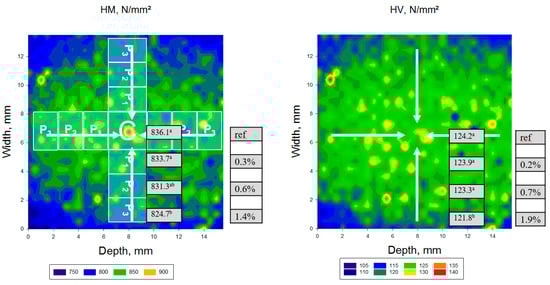 LU (Figure 5, Table 6) also followed a similar pattern in varying the measured properties within the zones, with the central and peripheral zone differences being less than 2% in the transversal section. Note that the outer peripheral zone P4 in the longitudinal section, which is larger than the transverse zone, showed a significantly higher variation in the measured properties compared to the central measurement location. However, the percentage decrease in HM, HV and Y in the direction of the peripheral zone did not exceed 3.3%, 4% and 1.7%, respectively, in longitudinal section.