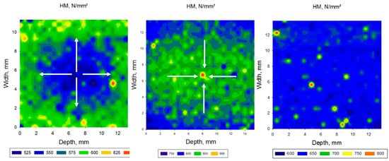 Comparative spatial distribution pattern of the Martens Hardness (HM) exemplified on SB (left), LU (middle), and TC (right).