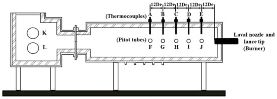 In the experiment preparation stage, thermocouples, which had a top that was 1 cm from the wall of the furnace, were installed at points A, B, C, D, and E, and the distance between the two monitoring points was 12 De, where De is the diameter of the exit of the Laval nozzle. Since, it was difficult to maintain uniform and stable temperatures in the high temperature furnace during the experiment, the average value of the temperature of thermocouples at each point was taken as the monitoring value of the temperature. Pitot tubes, which were applied to measure pressure, were installed at points F, G, H, I, and J. During the combustion experiment, the total pressure after the shock (P0a) and the static pressure before the shock (Pb) could be measured, and Equations (2) and (3) could be used to solve the total pressure before the shock (P0b). Points K and L were inlets for the ambient gas. A burner heated with methane was installed on the right side of the device to increase the temperature of the combustion furnace, as presented in Figure 1. At the beginning of the experiment, the combustion furnace was heated to the required temperature with the burner, and at the same time, the ambient gas was added to the furnace from points K and L. After the desired temperature was reached, the burner was removed, and a lance with a water cooling system was installed in its place. Then, the lance was supplied with oxygen and the experimental data was measured [16,17,18,19,20]. In this article, the temperatures at points A, B, C, D, and E were 1873 ± 16 K, 1873 ± 14 K, 1873 ± 10 K, 1873 ± 24 K, and 1873 ± 19 K, respectively.