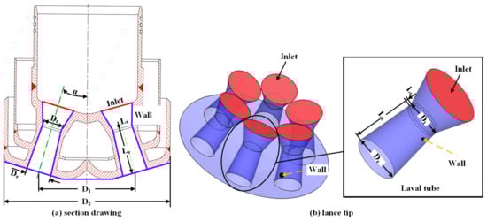 Figure 2a shows the cross-section view of the lance passing through two Laval tubes. Figure 2b is a three-dimensional perspective view of the established lance model that includes six uniformly distributed Laval tubes. As presented in Figure 2, the red and purple parts are the inlet and wall of the lance, respectively. The diameter of the throat and exit are Dt and De, respectively, whereas the lengths of the extension and throat are Le and Lt, respectively. D1 denotes the distance between the central axes of the Laval tubes; D2 is the outer diameter of the lance; and α is the angle between the nozzle holes. The specific dimensions of the lance tip apparatus are presented in Table 1.