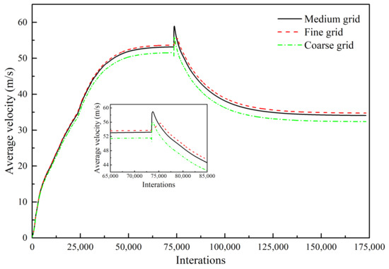 In the numerical simulations, to explore the degree of dependence of the calculated results on the grid resolution, three grid resolutions were applied to monitor the velocity of the center plane of a supersonic jet formed by one Laval tube under the condition of the composition of the ambient gas in Scheme 2: 697,800 grid points (fine-resolution grid), 550,784 grid points (medium-resolution grid), and 330,730 grid points (coarse-resolution grid) [12,13,14,15,16,17,18]. Figure 4 indicates the variation of the area-weighted average velocity of the longitudinal section for the three grids. For the three grid resolutions, the average velocity of the longitudinal section with the interations changes according to the same pattern. As the interations increases, the area-weighted average velocity gradually increases, and the average velocity reaches a stable value when the interations reach 50,000. The combustion model is turned on when the interations reach approximately 74,000. Therefore, the average velocity shows a peak, and the velocity gradually decreases and finally remains stable. The average velocity error of the coarse grid relative to the medium grid is 5% larger, whereas the average velocity error value is 2% larger for the medium grid relative to the fine grid. As the number of grid points increases, the calculation time doubles. Therefore, under the condition of ensuring accurate calculations, balanced by calculation efficiency, we used a medium-resolution grid for the numerical simulations.
