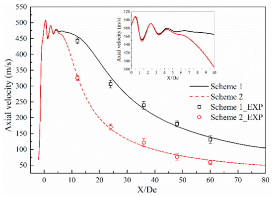 Figure 5 and Figure 6 show the axial velocity and axial total pressure distribution of the supersonic oxygen jet in the numerical simulation and combustion experiment of Schemes 1 and 2 [13,14,15,16,17,18,19,20]. Table 4 and Table 5 shows the average and standard deviation of the axial velocity and the axial total pressure at the monitoring point, respectively. For all schemes, the axial velocity and axial total pressure repeatedly fluctuates at the exit of the Laval tube. In the design process of the Laval tube, the outlet pressure of the Laval tube is 101,325 Pa and the temperature of the oxygen is 298 K. However, as oxygen is preheated and a combustion reaction occurs, the outlet pressure and temperature of the nozzle changes. Therefore, shocks are formed as the supersonic oxygen jet incorrectly expands. After the supersonic oxygen jet repeatedly fluctuated, the axial velocity of the jet stabilized, and the axial total pressure rapidly decreased to become equal to the pressure of the ambient air.