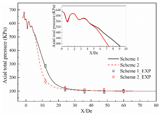 A comparison of the combustion experiment results and numerical simulation results is presented in Figure 5 and Figure 6, where the black solid line and the red dashed line indicate the numerical simulation results of Schemes 1 and 2, respectively, and □ and ○ represent the experimental results under the same schemes. The maximum error values of axial velocity of the combustion experiments of Schemes 1 and 2 are 12.20% and 12.70%, respectively. The maximum absolute errors of axial velocity between the results of numerical simulation and combustion experiment of Schemes 1 and 2 are 6.38% and 9.65%, respectively. The maximum error values of the total axial pressure of the combustion experiments of Schemes 1 and 2 are 15.30% and 14.50%, respectively. The maximum absolute errors of axial total pressure between the results of the numerical simulation and combustion experiments of Schemes 1 and 2 are 9.36% and 9.11%, respectively.