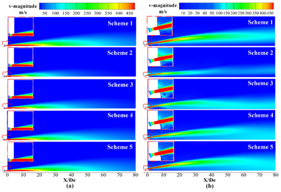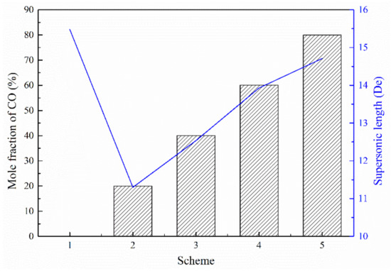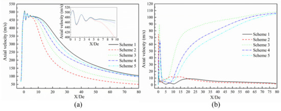 Figure 8 presents the axial velocity distribution of the supersonic jets produced by the Laval nozzle and the lance tip. As presented in Figure 8a, the axial velocity of the jet at the outlet of the Laval nozzle oscillates and then gradually decreases as the jet propagates away. The decay of the axial velocity in the range of 10 to 40 De was greater than the decay of the axial velocity in the range of 40 to 80 De. According to the statistical analysis of the supersonic length of the Laval nozzle, the supersonic length of Scheme 1 was found to be 15.48 De. The supersonic lengths of Schemes 2–5 were 0.73, 0.81, 0.90, and 0.95 times the length found in Scheme 1, respectively—as presented in Figure 9. Comparing Scheme 1 and other schemes, it can be seen that the combustion reaction between the ambient gas and the oxygen jet has an effect on the velocity distribution of the supersonic jet, and for Schemes 2–5, as the mole fraction of the ambient gas composition changes, the length of the supersonic jet gradually increases. This phenomenon confirms that the composition of the ambient gas has an influence on the velocity distribution of the supersonic jet. The reason should be that the supersonic oxygen jet is related to the combustion of carbon monoxide in the ambient gas.