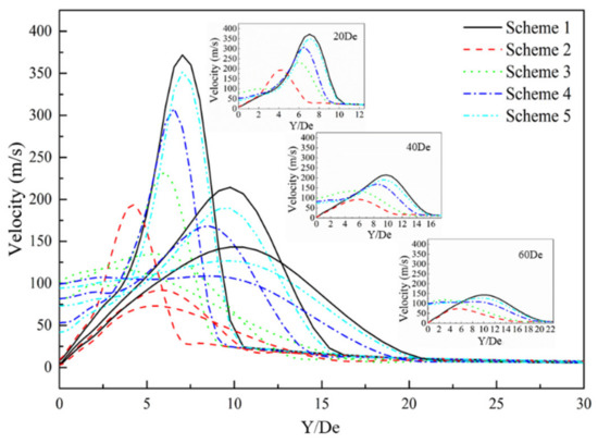Figure 10 presents the radial velocity distribution of the supersonic jet produced by the lance tip at different positions. It can be seen that the radial velocity of the jet exhibits a trend of increasing first and then decreasing to zero. At positions close to the Y/De = 0, the speeds in Schemes 1 and 2 show a consistent pattern, whereas those of Schemes 3–5 exhibit similar behavior. The radial velocity of Scheme 2 first reaches a maximum, followed by maxima for Schemes 3–5. Schemes 1 and 5 are almost the same, which indicates that when the carbon monoxide in the furnace gas and oxygen jets undergo a combustion reaction, the velocity distribution of the supersonic jet in the radial direction will be affected, and the magnitude of the influence is inversely proportional to the size of the carbon monoxide mole fraction in the environment.