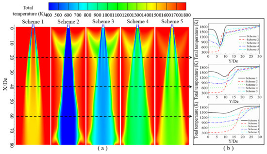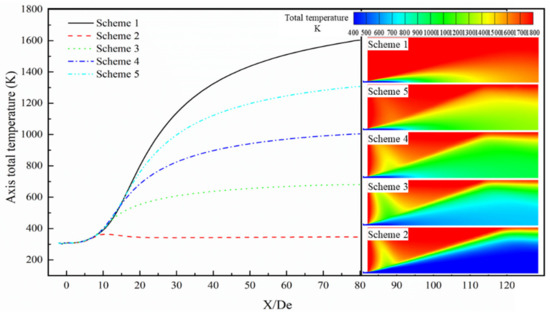 It can be seen from the contours of the total temperature distribution in Figure 12 that low-temperature zones are mainly located along the axis of the single jet, and the total temperature at the position between the gas streams is lower than the ambient temperature. Recall that Scheme 1 does not consider combustion reactions, and in this scheme, it can be observed that as the jet advances, the oxygen stream and ambient gas become mixed, so that the single jet gradually converges toward the jet’s axis, and the temperature of the oxygen in the jet gradually increases [16]. In comparing Schemes 2–5 with Scheme 1, it can clearly be observed that when the oxygen jet comes into contact with the ambient gas, a burning phenomenon occurs, so that a clear triangular area appears near 10 De. In Schemes 2–5, it can be observed that as the CO content in the ambient gas increases, the total temperature near the axis gradually increases, among which Scheme 2 has the lowest temperature, which is almost equal to the inlet oxygen temperature, and Scheme 5 has the highest temperature.