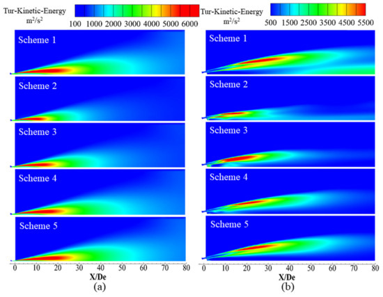 Figure 13 presents the turbulent kinetic energy distribution of a longitudinal section of the supersonic oxygen jet in different environmental gas compositions under a high-temperature environment. For high-temperature and CO-containing environments, the oxygen jet reacts with the ambient gas and becomes enveloped by a combustion flame. It can be seen from Figure 13 that for Schemes 2–5, as the volume fraction of CO in the ambient gas increases, the turbulent kinetic energy of the jet boundary layer gradually increases, but they are all less than the turbulent kinetic energy observed in Scheme 1. This phenomenon has an impact on the density of the ambient gas and the oxygen jet density ratio, thereby affecting the size and distribution of the turbulent kinetic energy.