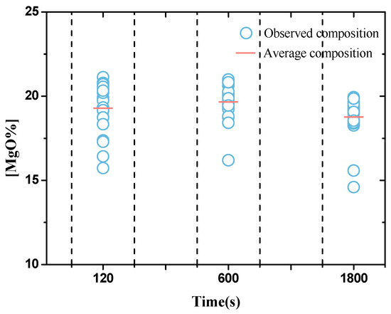 SEM-EDS was used for detecting compositions of 50 inclusions in samples at 120, 600, and 1800 s. As shown in Figure 1, the average content of MgO in inclusions at 120, 600, and 1800 s was 19.3%, 19.7%, 18.8%, respectively. According to the Al2O3-MgO phase diagram [26] at 1873 K (1600 °C), inclusions exist as Al2O3 + spinel, spinel, and spinel + MgO when MgO is below 16%, in the range 16% to 28% and above 28%, respectively. In the current work, deoxidation product with Al-Mg were MgAl2O4 inclusions.