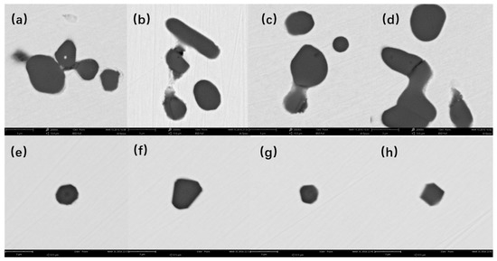 Figure 2. Morphologies of typical inclusions in samples by SEM: Al2O3 (ad); MgAl2O4 (eh).