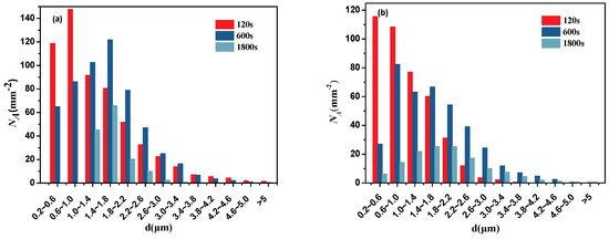 The two-dimensional size distribution of inclusions as a function of the holding time with Al deoxidation and with Al-Mg complex deoxidation are shown in Figure 3. NA represents the number density in a certain range of inclusion size and it is obtained by calculating the quotient of the number of inclusions in a sample and the area of sample. Based on references [18,25], the inclusion size distribution tends to be log-normal curves. It is close to log-normal distribution for inclusions with Al deoxidation, but half-normal curves for inclusions with Al-Mg complex deoxidation at 120 s, which indicates that the inclusions were smaller than 0.2-μm generates with Al-Mg complex deoxidation at 120 s. Meanwhile, the small inclusions with Al-Mg complex deoxidation generate indicates that the initial size of inclusions were small and the critical size of nuclei was small. After deoxidation for 120 s, the number density with Al-Mg complex deoxidation at the range from 0.2–0.6 μm is approximately equal to the number density with Al deoxidation. Therefore, there is a slight difference in the number of inclusions between Al deoxidation and Al-Mg complex deoxidation, which indicates that the nucleation rate of inclusions with Al-Mg complex deoxidation is close to the nucleation rate of inclusions with Al deoxidation. However, compared with inclusions deoxidated by Al, the number density of large size inclusions is lower with Al-Mg complex deoxidation at 120, 600, and 1800 s, respectively. It shows that inclusions with Al deoxidation are easy to coarse. In addition, it is found that the proportion of large size inclusions increases with the holding time as a result of growth or collision. There were inclusions with 4.6 μm with Al deoxidation at holding time of 120 s, it suggests that Al2O3 inclusions aggregated rapidly.