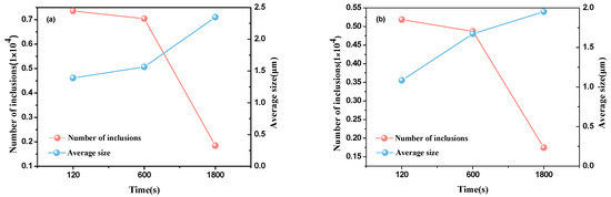 Figure 4 shows that the average size of inclusions increases generally, and the number of inclusions decreases with holding time elapsed. After deoxidation for 120 s, the average size of inclusions with Al deoxidation is 1.3 times as many as inclusions with Al-Mg complex deoxidation, which indicates that the critical size of nuclei of inclusions with Al-Mg complex deoxidation is smaller than inclusions with Al deoxidation. Though the number of inclusions deoxidated by Al-Mg is lower than those deoxidated by Al, as shown in Figure 4, the inclusion size distribution tends to be half-normal curves for inclusions with Al-Mg complex deoxidation, as shown in Figure 3b. Therefore, the actual number of inclusions with Al-Mg complex deoxidation is approximately 2 times as many as the observed inclusions shown in Figure 4, which indicates that the number of inclusions deoxidated by Al-Mg is larger than those by Al. In addition, at the process from 600 s to 1800 s, the average size increases by 0.2 with Al-Mg complex deoxidation and 0.5 with Al deoxidation, respectively, which indicates that the coarsening rate of inclusions with Al deoxidation is larger than inclusions with Al-Mg complex deoxidation. However, at the process from 120 s to 1800 s, the rate of increase for average size with Al deoxidation is larger than inclusions with Al-Mg complex deoxidation as a result of flotation of large size Al2O3 inclusions.