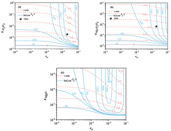 The calculated critical size of nuclei and nucleation rate for oxide inclusions at 1873 K (1600 °C) are shown in Figure 5. The critical size of nuclei is obtained by substituting Equation (3) and relevant data in Table 4 to Equation (2), and then the value of SO is known when the rC is a certain value. According to the relationship between SO and KMO (SO = KMO/Kequilibrium.(O)), it is easy to obtain the relationship between aO and KMO, as shown in Figure 5. Keq.(O) is the equilibrium constant per mole oxide, as shown in Table 5, and the KMO is solubility product per mole oxide (KMO = aM1/XaO, in this work, KAl2O3 = aAl2/3aO, KMgAl2O4 = aMg1/4aAl1/2aO, KMgO = aMgaO). The method to obtain the nucleation rate is similar to the critical size of nuclei by substituting relevant data to Equation (1). In Figure 5, the red dotted lines are the critical size of nuclei, the blue solid lines are the nucleation rate and the black spherical marks are the rC and lnI value based on the compositions of experimental melts. The calculated results show that there is little difference in the critical size of nuclei for Al2O3, MgAl2O4, and MgO with size from 0.1 to 2 nm. It indicates that the nucleation rate is strongly dependent on the activity of oxygen when ao exceeds a certain value and the nucleation rate for Al2O3, and MgAl2O4 increases with the increasing ao. The critical size of nuclei for Al2O3 and MgAl2O4 decreases with the increasing ao and KMO, and MgO increases first and then decreases. Based on the compositions of melt, the calculated results show that the critical size of nuclei at holding time of 120 s increases in the order of MgAl2O4 (0.3–0.4 nm) < Al2O3 (0.4–0.6 nm) and the nucleation rate increases in the order of Al2O3 (1100 cm−3 s−1) < MgAl2O4 (1200 cm−3 s−1). At the early stage of deoxidation, the calculated results show that the size of Al2O3 inclusions is larger than MgAl2O4 inclusions, and the nucleation number of MgAl2O4 inclusions is larger than Al2O3 inclusions.