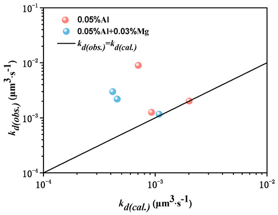kd(cal.)/kd(calculation) from Ostwald growth and kd(obs.)/kd(observation) from inclusion size was obtained by considering the oxygen diffusion, as shown in Figure 6. kd(obs.) can be expressed by Equation (9) and kd(cal.) can be expressed by Equation (10). Figure 6 shows that the coarsening rate of MgAl2O4 inclusions was smaller than Al2O3 inclusions whether kd(cal.) from Ostwald growth or kd(obs.) from inclusion size. Though there are half points lying at line kd(cal.) = kd(obs.), the difference between kd(cal.) and kd(obs.) is controlled within an order of magnitude. In addition, the experimental results show that the number of inclusions decreases sharply from 600 s to 1800 s as a result of floatation of large number of inclusions, which affects the calculated results.