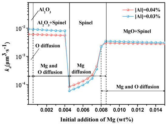 It is necessary to consider the diffusion of deoxidation metal element duo to the same order of magnitude between magnesium content and oxygen content. The effect of Mg addition on the Ostwald growth of inclusions with [Al] of 0.04% and 0.03% was obtained by considering the oxygen diffusion and magnesium diffusion, as shown in Figure 7. The coarsening rate kd(Mg/Al) can be expressed by Equation (11), in which the notations are similar to Equation (10). DMg/Al is assumed to be equal to the DO because the solute diffusivities in liquid Fe are considered to be the same order of magnitude [22].