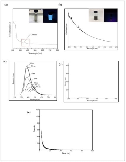 The PL spectra of CQD as a function of excitation wavelengths (300–450 nm) are shown in Figure 2c. A strong PL emission peak located at 425 nm was observed with an excitation wavelength of 300 nm, most probably due to the largest number of particles which are being excited at this wavelength. The emission peak observed shows a shift to a higher wavelength (red shift) with the increase of the excitation wavelength. This indicates the dependency of emission and PL intensity to excitation wavelength. Other reason contributes for the excitation dependent PL behavior of CQD is the nature of their surface. The presence of functional groups such as hydroxyl, carbonyl and carboxyl on CQD might lead to a series of emissive traps between π and π* of C-C. Thus, the PL mechanism is speculated to be determined by both the size effects and the surface defects []. The PL spectra of EFB biochar at an excitation wavelength of 300 nm is shown in Figure 2d. It shows that the suspension obtained exhibits no peaks compared to the hydrothermally processed CQD. Without the hydrothermal process, EFB biochar does not fluoresce under UV light source.