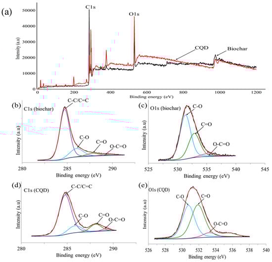 X-ray photoelectron spectroscopy (XPS) results related to CQD and EFB biochar, (a) full spectrum, (b) C1s spectra of EFB biochar, (c) O1s spectra of EFB biochar, (d) C1s spectra of CQD and (e) O1s spectra of CQD.