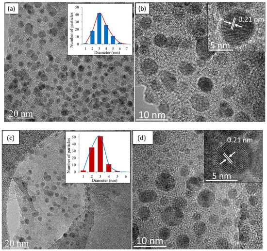 HRTEM images of as prepared CQD are shown in Figure 6a,b. Figure 6a clearly shows that the size of CQD are small, nearly spherical in shape, and monodispersed. The histogram size distribution of CQD illustrated by the inset, shows that the majority of the dots lie in the range of 1–6 nm, with an average diameter of 3 nm (calculated from micrographs of 100 random particles). The high-magnification HRTEM of CQD depicted in Figure 6b, show that the dots exhibit good crystallinity with lattice fringes of 0.21 nm, which correspond to the (100) plane of graphitic carbon []. As shown in Figure 6a,b, the CQD obtained in this work were relatively uniform with a good crystalline structure.