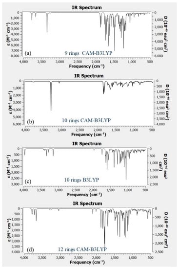 Infrared (IR) spectrum related to (a) CQD with 9 rings (CAM-B3LYP), (b) CQD with 10 rings (CAM-B3LYP), (c) CQD with 10 rings (B3LYP), (d) CQD with 12 rings (CAM-B3LYP).