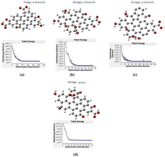The molecular structure and energy corresponding with (a) CQD with 9 rings (CAM-B3LYP), (b) CQD with 10 rings (CAM-B3LYP), (c) CQD with 10 rings (B3LYP), (d) CQD with 12 rings (CAM-B3LYP).