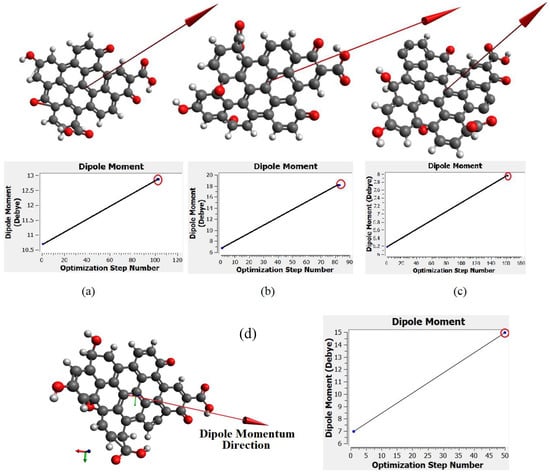 Figure 10a–c show the molecular structure of CQD with 9, 10, 12 rings, respectively that was obtained with the CAM-B3LYP method; and Figure 10d shows the molecule structure of CQD with 10 rings (B3LYP) that found from B3LYP method. These molecular structures are in the stable form with minimum energy equal to −1866.9022, −2057.4905, −2207.1601, and −2034.8 Hartree which were derived from Figure 10. The optimal structure was obtained when the maximum force and maximum displacement were less than threshold and the minimum energy was achieved. The pertinent parameter is summarized in Table 4. Figure 11a–d show the dipole momentum direction and amount. The dipole momentum for first and last structure can derive from each plot, and the dipole momentum were 12.8650, 18.1699, 7.9503 and 14.979 Debye, at the stable molecular structure of CQD at minimum energy. Consequently, the optimal structure was derived from DFT/CAM-B3LYP/6-31G (p).