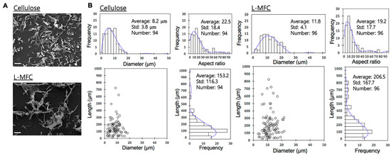 The SEM images of the prepared cellulose and L-MFC are shown in Figure 1A. The results of the particle size analysis of the two different nanocelluloses measured from the optical images are shown in Figure 1B. The average length of the lignin-free nanocellulose and L-MFC was 153.2 µm ± 116.3 µm and 206.5 µm ± 167.7 µm, respectively. In addition, the average diameter was 8.2 µm ± 3.8 µm and 11.8 µm ± 4.1 µm for the cellulose and L-MFC, respectively. Based on the average length and diameter from the optical images, the aspect ratio (L/d) was calculated to be 19.2 and 22.5 for L-MFC and cellulose, respectively, suggesting that lignin-free nanocellulose had more slender particles than L-MFC, as shown in Figure 1B. Although the dimensions of nanocellulose and L-MFC prepared might be slightly coarser, we determined to use these samples for the cytotoxicity analyses without any further preparation.