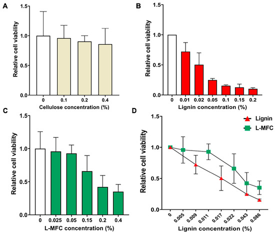 Toxicity of cellulose, L-MFC, and lignin in HEK293 cells. (A) Water-soluble tetrazolium salt (WST) assay results with cellulose at concentrations 0, 0.1 and 0.2%. Error bars show standard deviation (s. d.; n = 12 biological replicates). (B) WST assay results with lignin in increasing amounts showing marked cytotoxicity. Error bars show s. d. (n = 12). (C) WST assay results with L-MFC. Error bars show s. d. (n = 12). (D) Comparison between pure lignin and lignin contained in L-MFC for cytotoxicity. Error bars show s. d. (n = 3).