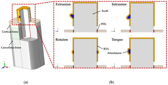 Finite element model built for each of the 4 orthodontic treatment situations. (a) Assembled model with bones, teeth, periodontal ligament (PDL), attachment, and removable thermoplastic aligner (RTA). (b) Extrusion, intrusion, rotation, and torque situations.