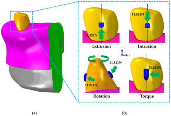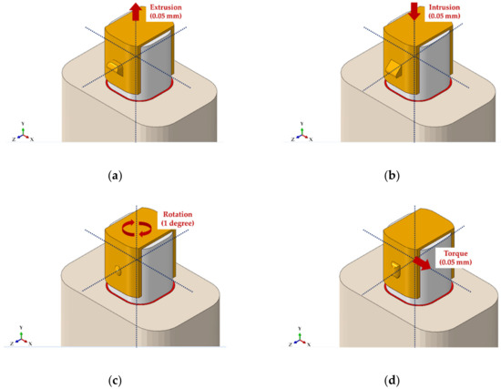 As the movement and rotation of teeth are generated by the RTA, load was applied by controlling the displacement and rotation of RTA. The orthodontic treatment models for extrusion, intrusion and torque applied load by the means of displacement control, whereas load was applied in the rotation orthodontic treatment model using rotation control method (Figure 3a–d). The extrusion model was moved 0.05 mm in the positive direction on the y-axis while the intrusion model was moved in the negative direction. The torque model was moved 0.05 mm in the positive direction of the x-axis, while 1 degree rotation was applied in the negative direction based on the y-axis for the rotation model (Figure 3a–d) [3].
