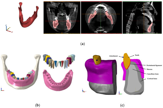 The process of building a 3D mandibular finite element model that includes the teeth, mucosa, PDL, cortical bone, cancellous bone and attachments and the cross-sectional view of the mandibular canine orthodontic treatment model. (a) Mandibular reconstruction process through 3D CBCT; (b) Building cortical bone, cancellous bone, mucosa and teeth models; and (c) Building orthodontic treatment model with attachments in place.
