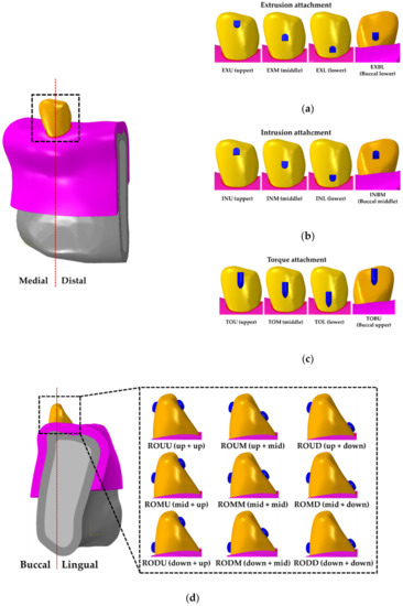 However, in the orthodontic treatment, various movement mechanisms such as extrusion, intrusion, rotation, and torque are applied [15], and the positions of the attachments attached on the surface of the teeth vary. In the previous studies, most of the analyses were made on the effectiveness of attachments at specific orthodontic treatment stages, rather than on the movement mechanism and the position of attachments [6,12,13,14]. Therefore, there is a need for a comparative analysis on the various positions of attachments fixed on the surface of teeth and the movement mechanism of teeth at each orthodontic stage, as well as research on the distribution of stress delivered to the inside of teeth.