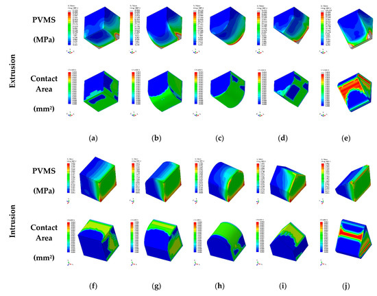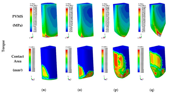 Results of stress distribution and contact area for attachments in each orthodontic treatment situation. (a) EX1; (b) EX2; (c) EX3; (d) EX4; and (e) EX5 for extrusion attachment; (f) IN1; (g) IN2; (h) IN3; (i) IN4; (j) IN5 for intrusion attachment; (k) RO1; (l) RO2; (m) RO3 for rotation attachment; (n) TO1; (o) TO2; (p) TO3; (q) TO4 for torque attachment.