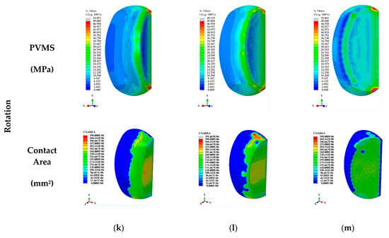 The PVMS and displacement values of attachments and the teeth are shown in Figure 9a–g and the rotation values of rotation attachment were shown in Figure 8h after measuring the angle before and after loading by extracting the nodes from the center of the buccal and lingual sides of the surface of attachment.