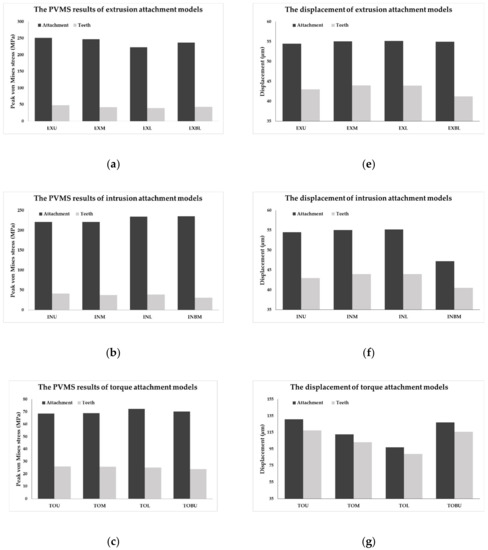 In the extrusion attachment model, it was confirmed that the PVMS values of attachments and the teeth decreased as the attachment position moved from the incisal to the gingival positions of the teeth at the buccal side whereas the displacement values of the teeth increased as opposed to the stress distribution patterns (Figure 9a,e). In addition, the results were similar for the lower region of the lingual side and the lower region of the buccal side of the teeth (Figure 9a,e). In the intrusion attachment model, unlike in the extrusion model, the PVMS values increased as the attachment position moved from incisal to gingival positions. The PVMS values were the lowest when the attachments were fixed at the center of the teeth in the buccal side and the highest when attached at the center of the lingual side of the teeth (Figure 9b). The displacement values of attachment and teeth were the highest when the attachment position was at the center of the teeth in the buccal side unlike in the extrusion attachment, and the lowest displacement value was observed when the attachment was positioned at the center of the lingual side of the teeth (Figure 9f). In the torque attachment model, there was no difference in the PVMS of the teeth values when the attachments were the teeth at the buccal side and the lowest PVMS of the teeth was observed when the attachment was fixed on the upper region of the lingual side of the teeth (Figure 9c). The PVMS values of attachments were the highest when the attachments were on the lower region of the teeth (Figure 9c). In the buccal side of the teeth, the displacement values of the attachment and teeth tended to decrease as the position moved to downward, and the displacement values for upper region of the lingual side of the teeth were similar to those of the upper region of the teeth at the buccal side (Figure 9g).