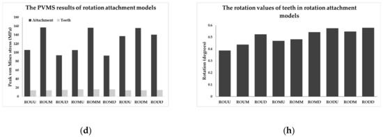 In the rotation attachment model, the PVMS values of the teeth did not show a difference among the groups but the PVMS values of attachment showed a different among the groups. The PVMS values of attachments were measured to be the lowest in the ROUD and ROMD models, followed by the ROUU and ROMU models (Figure 6d). In the rest of the models excluding the four models, a high value of at least 120 MPa was observed (Figure 9d). The rotation for the rotation attachment ranged from the minimum of 0.39 degrees to the maximum of 0.58, in the order of RODD, RODU, RODM, ROMD, ROUD, ROMM, ROMU, ROUM, and ROUU from the highest to the lowest (Figure 9h).