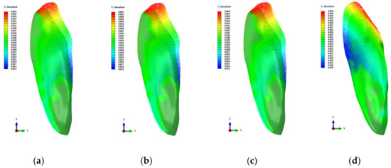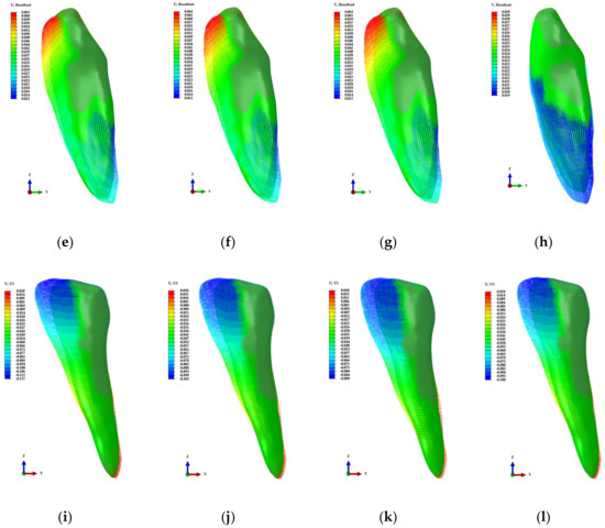 The displacement distribution of the teeth in various attachment models. (a) upper position; (b) middle position; (c) lower position in buccal side of the teeth; and (d) lower position in lingual side of the teeth for the extrusion attachment; (e) upper position; (f) middle position; (g) lower position in buccal side of the teeth; and (h) middle position in lingual side of the teeth for the intrusion attachment; (i) upper position; (j) middle position; (k) lower position in buccal side of the teeth; and (l) upper position in lingual side of the teeth for the torque attachment.