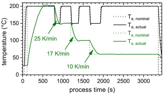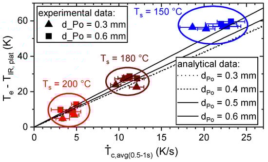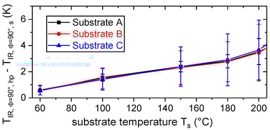 Furthermore, the surface temperature of the substrate, TIR,Φ=90°,s, was compared to the surface temperature of the hot plate, TIR,Φ=90°,hp, which was controlled by a thermocouple (Ts). For this purpose, the metal parts were covered with polyimide tape and the temperature distribution was determined by means of thermography (Φ = 90°, Figure 2). To account for local detachments between metal and tape, the maximum observed temperature within a measuring area of at least 1 cm2 × 1 cm² was used for the comparison. According to Figure 7, the temperature difference, TIR,Φ=90°,hp − TIR,Φ=90°,s, increased with increasing set temperature and reached up to 6 K due to convective and radiative heat transfer. Moreover, temperature gradients within the substrates lead to variations of up to 5 K.