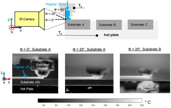Schematic measurement setup of the three different thermographic measuring configurations with respect to the angle of vision (Φ = 0°, 25° and 90°)—top (not to scale). Extract of emissivity corrected thermograms for different angles of vision and substrate positions during the material extrusion process (Te = 200 °C, Ts = 150 °C)—bottom.