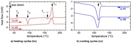 Parallel shifted heat flows of the first and second heating (hc) and cooling (cc) cycles with marked temperatures for Tg: glass transition, Tpc: post crystallization, Tα→α’: crystalline phase transition, Tm: melting and Tc: crystallization. The heating and cooling rate was 10 K/min for each cycle.