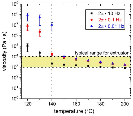 Temperature dependence of the viscosity for three different shear rates (ω = 2π 10 Hz, 2π0.1 Hz, 2π0.01 Hz). The typical processing viscosity range for extrusion (103–104 Pas cf. e.g., []) is marked.