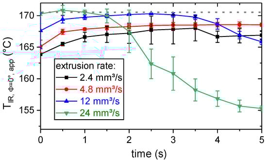 Apparent surface temperature, TIR, Φ=0°, app, of the PLA right below the extrusion nozzle for different extrusion rates, determined by thermography based on an assumed emissivity of 1.