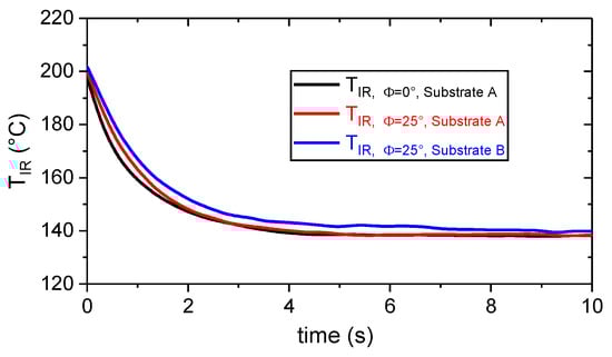 The local polymer surface temperature, TIR(x,t), was computed as an average of three values right in the middle of the projected polymer track as displayed in the thermogram (cf. Figure 2). The TIR(t) signal was smoothed with a zero-phase moving average of 10 in order to reduce noise. This was especially essential before computing the cooling rate, . As indicated in Figure 8, the measuring configuration (cf. Figure 2), by means of the viewing angle (Φ = 0° vs. Φ = 25°) and position (substrate A vs. substrate B), had no significant influence on the observed polymer cooling behavior. Measuring TIR, Φ=25° allows the ME process to be monitored at any position on the substrate surface hereafter.