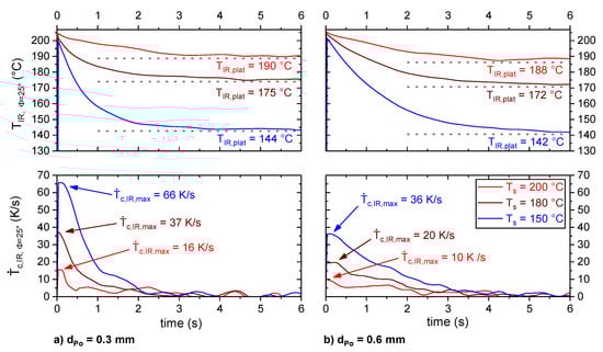 The plateau temperature, TIR, plat, which shows a clear correlation with the substrate temperature, Ts, took up to 6 s to be reached (cf. Figure 9). However, during the ME process of an actual part it is usually not possible to monitor any point for such a long time with the current setup, as the extruder and substrate move, so the point of interest leaves either the field of view or the focus plane. Hence, it was attempted to correlate the plateau temperature, TIR,plat, with the thermographic information right after the extrusion. In order to define such a parameter, which strongly depends on TIR,plat and is nearly independent of dPo, the cooling rate was considered in more detail.