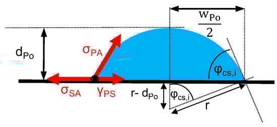 In general, clean metallic and oxidic surfaces possess a high surface tension, , and are wetted properly by liquids with a low surface tension like polymers— []. However, Equation (3) does not account for differences between the advancing and receding angle, as well as for kinetically ruled process. In thermal equilibrium, liquids with an elevated viscosity, like polymer melts, wet the substrate gradually. The contact angle continuously decreases until it reaches equilibrium. Depending on the viscosity of the polymer melt, this process can take some 10 min (cf. e.g., []). In this study, the extruded polymer melt wetted the substrate while it cooled and, in the case of Ts = 150 °C, began to crystallize (cf. Figure 4 and Figure 5). Hence, the polymer underwent a rapid and distinctive change in viscosity. The resulting contact angle highly depended on the timely change in viscosity and corresponds to a frozen non-equilibrium state. Thus, a frozen state of the contact angle was achieved, which depends on the thermal history—namely the time at elevated temperature and cooling rate (cf. Figure 1). Therefore, the determined contact angles are only suited for a comparative assessment for the given setup and processing. The process parameters layer height, dPo, and width, wPo, determine the initial shape of the polymer trace. By assuming a cylinder segment geometry (cf. Figure 10), the initial contact angle, φcs,i, can be calculated according to Equation (4).