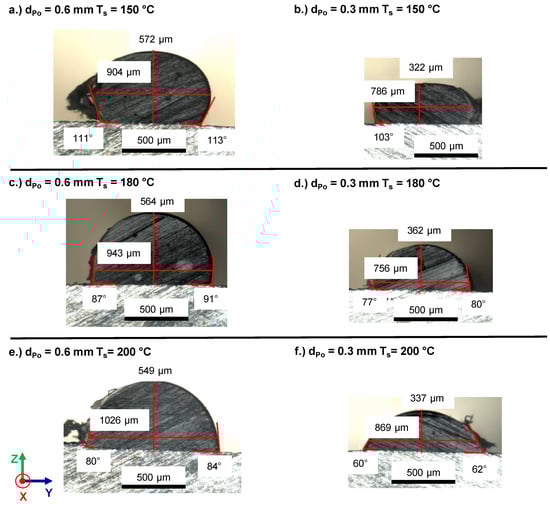 Brightfield light microscopic images for contact angle measurement for dPo = 0.6 mm (a,c,e) and dPo = 0.3 mm (b,d,f) high traces deposited on a substrate with a temperature of Ts = 150 °C (a,b), Ts = 180 °C (c,d) and Ts = 200 °C (e,f).