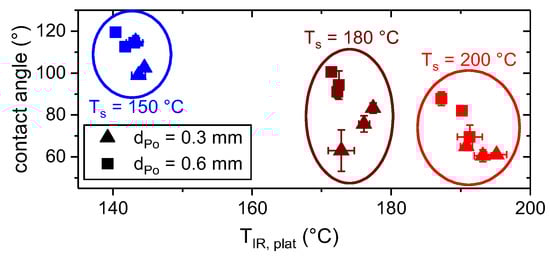 Contact angle as measured in light microscopic images (cf. Figure 11) as a function of plateau temperature, TIR, plat, for dPo = 0.3 mm and dPo = 0.6 mm high traces.