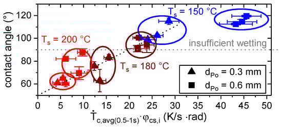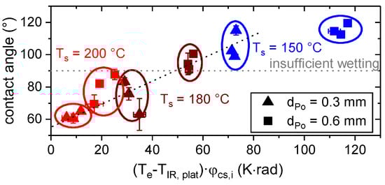 According to Figure 12, the contact angle decreased with increasing thermographic measured plateau temperature, TIR, plat. This is in conjunction with the temperature reaction of the viscosity (cf. Figure 5) and the general suggestions for the applications of hotmelts (cf. e.g., []).