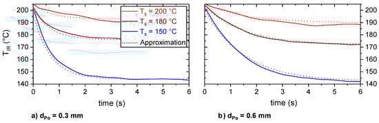 According to the difference in TIR,plat between dPo = 0.3 and dPo = 0.6 mm the temperature gradient within the polymer was about 2 to 3 K per 0.3 mm (cf. Table 2). Considering Ts = 150 °C and dPo = 0.3 mm, a reduction of the substrate surface temperature of about 3 K (cf. Figure 7) and a temperature gradient of 2 K per 0.3 mm in the polymer results in a polymer surface temperature of 145 °C, which is comparable to the thermographic determined polymer surface temperature (TIR,plat = 143.8 ± 0.7 °C—cf. Table 2). Hence, the assumption of a temperature independent emissivity was appropriate for the investigated temperature range.