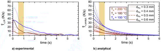 Cooling rates of the experimental (a) and analytical (b) temperature profiles for different layer heights, dPo, and substrate temperatures, Ts. For the analytical approximation, TIR,e and TIR,plat were interpolated linearly between the average values for the layer heights 0.3 and 0.6 mm (cf. Table 2).