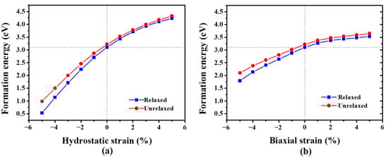 where is the total energy of the strained system containing N W atoms and vacancies. According to our calculations, the vacancy formation energy in strain-free W is 3.11 eV, consistent with the previous studies [24,51,52]. Figure 1 shows the formation energy of a monovacancy in strained W. Under both hydrostatic and biaxial strain, the formation energy of a monovacancy increases with the increasing of tensile strain, while it decreases with the increasing of compressive strain. This suggests that the compressive (tensile) strain facilitates (suppresses) the formation of vacancy in W. Furthermore, as displayed in Figure 1, the variation of formation energy under hydrostatic strain is much higher than that under biaxial strain.